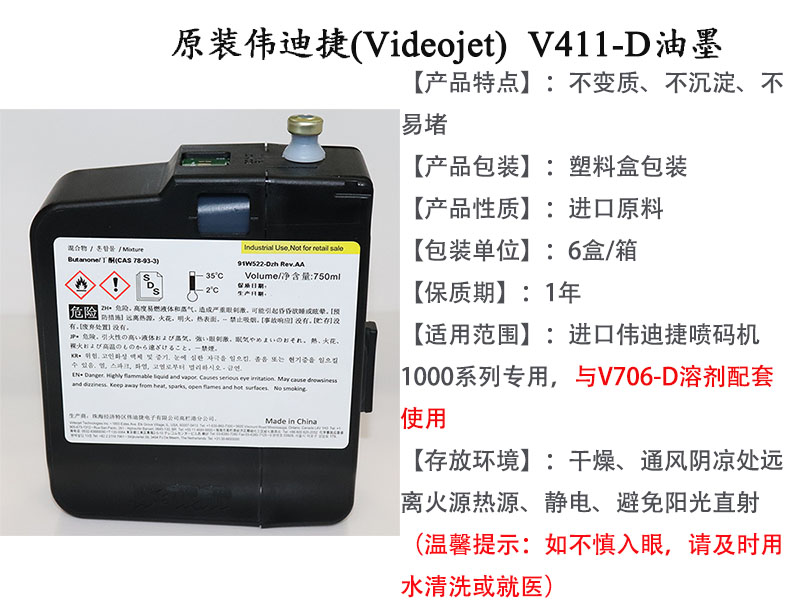 乔捷机电供应伟迪捷喷码机油墨V411-D及其他耗材,有喷码机油墨、稀释剂、清洗剂等,上海乔捷机电有限公司是伟迪捷品牌授权代理商,专门代理伟迪捷品牌喷码机及其耗材,是国内知名度较高的喷码机服务商,公司成立至今已有近十五年的行业服务经验,值得您的信赖!